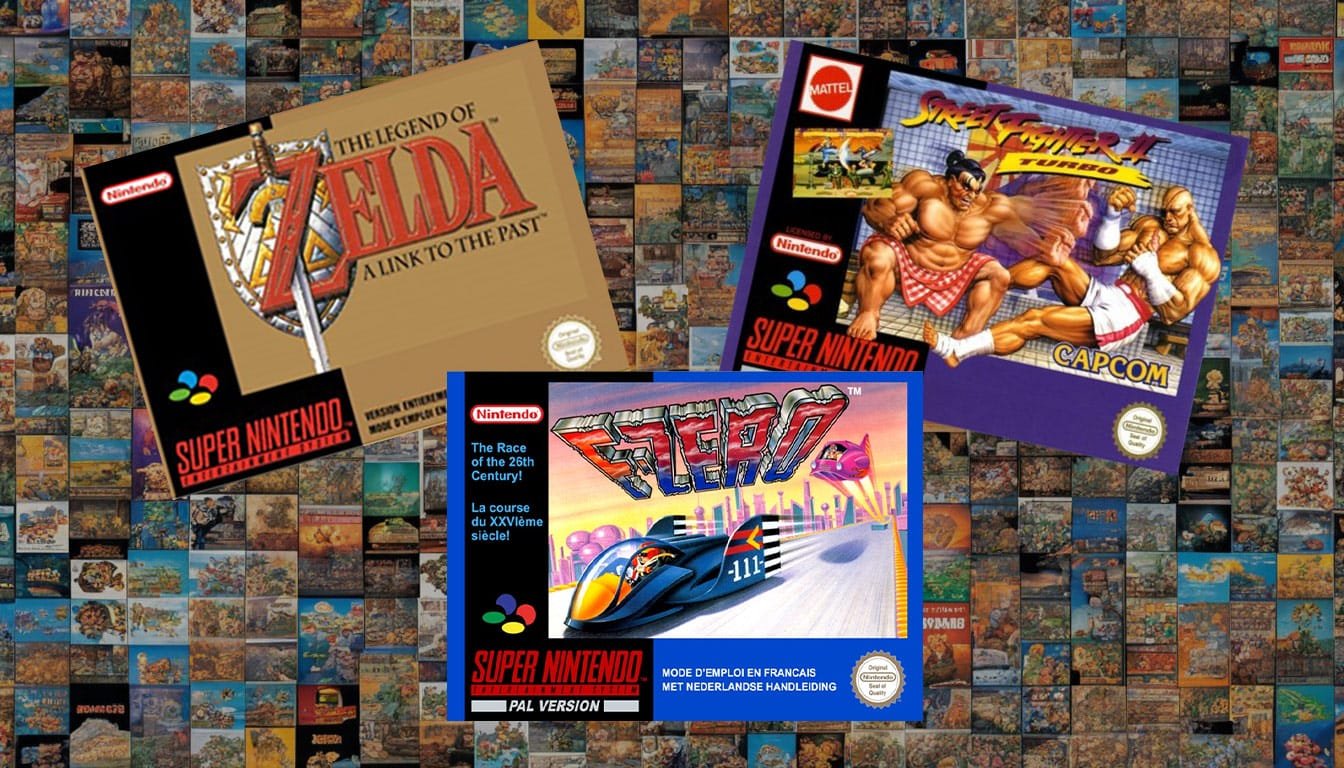 Une collection de cartouches de jeux emblématiques de Super Nintendo arrangées dans une liste des 10 meilleurs, avec des étiquettes colorées et des designs distincts.